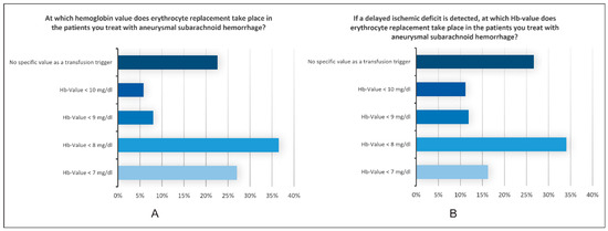 Results of the question regarding hemoglobin values and erythrocyte replacement in patients with aSAH, either without (A) or after (B) the detection of delayed ischemic deficit. The X-axis represents the percentage of responses we received for each answer shown on the Y-axis, which included different hemoglobin value thresholds. Most respondents indicated they would initiate erythrocyte replacement at hemoglobin levels below 8 mg/dL, both with and without DCI.