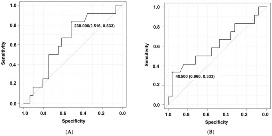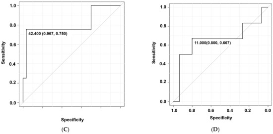 The additional ROC analysis was performed based on the multivariate analysis. The analysis between mechanical complication and operation time demonstrated the AUC of 0.633 (0.452–0.814) with the cutoff value of 238 min (Figure 2A). The analysis between mechanical complication and postoperative PI-LL demonstrated the AUC of 0.615 (0.401–0.829) with the cutoff value of 40.5 degrees (Figure 2B). The analysis between PJK and postoperative PI-LL demonstrated a high AUC value of 0.808 (0.471–1) with the cutoff value of 42.4 degrees (Figure 2C). The confined analysis in thoracolumbar OVF between MC and postoperative LK demonstrated the AUC of 0.656 (0.326–0.985) with the cutoff value of 11.0 degrees (Figure 2D).