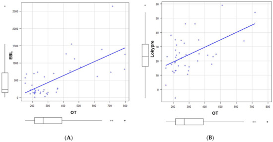 Linear regression analyses between operation time and other parameters. (A): Correlation between operation time (OT) and estimated blood loss (EBL) with correlation coefficient of 0.691. (B): Correlation between operation time (OT) and preoperative local kyphosis (Lokypre) with correlation coefficient of 0.514.