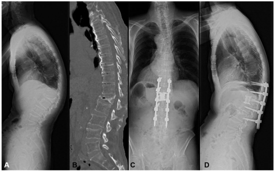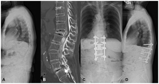 Due to the increase of aging populations, osteoporotic vertebral fracture (OVF) has become the frequent problem in many countries and has brought a significant impact on patients’ function, quality of life, and medical costs [1,2,3,4,5]. The primary treatment option is conservative. However, OVF with intractable pain, neurologic symptoms, pseudarthrosis, or severe progressive deformity requires surgical treatment. There are many surgical modality options, such as anterior, posterior, and combined anterior and posterior surgery [1,2,3,4,5]. Hosogane et al. surveyed the series of OVF surgeries comprising 403 patients [1]. It consisted of 87% posterior surgery, 8.7% anterior-posterior combined, and 4.7% anterior surgeries. The perioperative complications and mechanical complications (MC) consisting of screw loosening, screw backout, and proximal and distal junctional kyphosis (PJK, DJK) were 18.1% and 41.2%, respectively. Watanabe et al. surveyed 315 OVF patients and compared five different surgical modalities of anterior, posterior with or without osteotomy, anterior-posterior combined, and posterior with vertebroplaty [5]. The perioperative complications were 7.4 to 26%, and mechanical complications ranged from 14.8–26.3%.