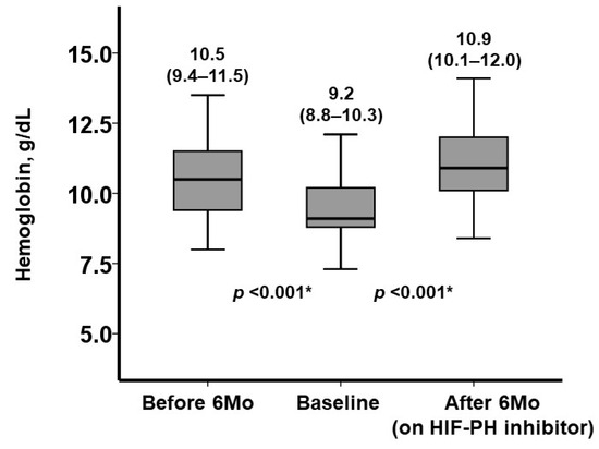 Trajectory of hemoglobin levels at three time points: six months before the initiation of HIF-PH inhibitors, baseline just before the initiation of HIF-PH inhibitors, and six months after the initiation of HIF-PH inhibitors (on treatment). When the trend analysis using Friedman test reached statistical significance, post hoc Wilcoxon signed-rank test was performed for two different time point data. * p < 0.05.