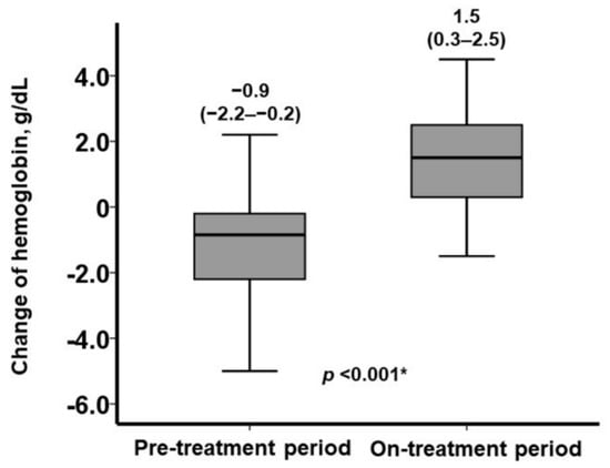 Changes in hemoglobin levels during six-month pre-treatment period and six-month on-treatment period. * p < 0.05 by Mann–Whitney U test.