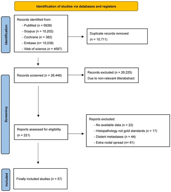 A comprehensive systematic literature review was conducted, yielding an initial pool of 36,307 studies. Duplicate removal left 26,446 unique articles for consideration. The title and abstract screening process further narrowed the selection to 221 records, and subsequent full-text screenings, employing predefined exclusion criteria, resulted in the exclusion of an additional 164 studies. Ultimately, a total of 57 studies were incorporated into the final systematic review and meta-analysis [1,4,12,13,14,15,19,20,21,22,23,24,25,26,27,28,29,30,31,32,33,34,35,36,37,38,39,40,41,42,43,44,45,46,47,48,49,50,51,52,53,54,55,56,57,58,59,60,61,62,63,64,65,66,67,68,69]. The study selection process and the reason behind exclusion are shown in the PRISMA flow diagram (Figure 1).
