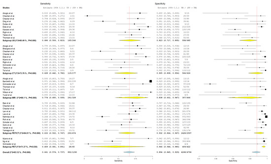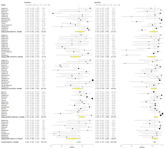 Forest plot of estimates of sensitivity and specificity for different imaging modalities in the Detection of Lymph Node Metastasis with Patient as a Unit of Analysis. Included studies [1,12,14,15,19,21,22,23,24,25,26,29,32,33,34,35,36,37,38,39,40,43,44,45,46,48,49,50,51,52,54,55,56,59,62,63,65,67,69].