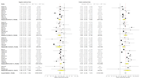 Forest plot of estimates of negative likelihood ratio and positive likelihood ratio for different imaging modalities in the Detection of Lymph Node Metastasis with Node as a Unit of Analysis. Included studies [4,13,19,20,26,27,28,30,31,34,35,39,41,42,46,49,52,53,54,57,58,60,61,64,66,68].