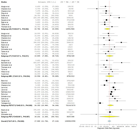 PET-CT demonstrated the highest diagnostic performance with a SEN of 74.5% and SPE of 83.6%. It also achieved the highest +LR of 4.303 and the lowest −LR of 0.249, resulting in the highest DOR of 15.487. In comparison, US, MRI, CT, and PET had lower diagnostic parameters, with PET-CT consistently outperforming them across all measures. Most of the pooled studies in the different subgroups were heterogeneous, as evidenced by χ2 p < 0.10 and I2 > 50%.