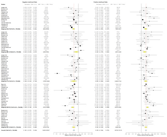 Forest plot of estimates of negative likelihood ratio and positive likelihood ratio for different imaging modalities in the Detection of Lymph Node Metastasis with Patient as a Unit of Analysis. Included studies [1,12,14,15,19,21,22,23,24,25,26,29,32,33,34,35,36,37,38,39,40,43,44,45,46,48,49,50,51,52,54,55,56,59,62,63,65,67,69].