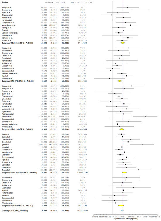 Forest plot of estimates of diagnostic odds ratio for different imaging modalities in the Detection of Lymph Node Metastasis with Patient as a Unit of Analysis. Included studies [1,12,14,15,19,21,22,23,24,25,26,29,32,33,34,35,36,37,38,39,40,43,44,45,46,48,49,50,51,52,54,55,56,59,62,63,65,67,69].