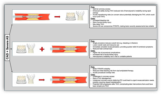 Central illustration. This figure delineates the potential benefits and limitations of the three strategic approaches to revascularization in managing CAD among patients undergoing TAVI: pre-TAVI, concomitant with TAVI, and post-TAVI. Pre-TAVI revascularization allows for CAD stabilization prior to valve intervention, potentially mitigating peri-procedural complications, though it may delay TAVI. Concomitant revascularization synchronizes CAD and valve interventions, optimizing procedural efficiency but at the cost of increased complexity and risk of complications. Post-TAVI revascularization simplifies the initial procedure, prioritizing valve implantation but may defer CAD management, posing risks of delayed adverse events and challenges in coronary access. Abbreviations: CAD: coronary artery disease, AS: aortic stenosis, TAVI: transcatheter aortic valve implantation, THV: transcatheter heart valve, FFR: fractional flow reserve, iFR: instantaneous wave-free ratio, PCI: percutaneous coronary intervention.