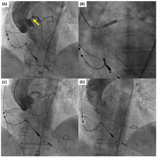 Simultaneous percutaneous coronary intervention (PCI) of the left main and transcatheter aortic valve implantation (TAVI) in an 80-year-old female patient with severe aortic stenosis and obstructive left main coronary artery disease (arrow). (A) Baseline aortogram showing aortic valve stenosis and critical stenosis of the left main coronary artery necessitating revascularization. (B) Stent implantation at the left main ostium. (C) Aortogram after PCI. (D) Aortogram after Accurate Neo2 (Boston Scientific, Natick, MA, USA) transcatheter aortic valve implantation.