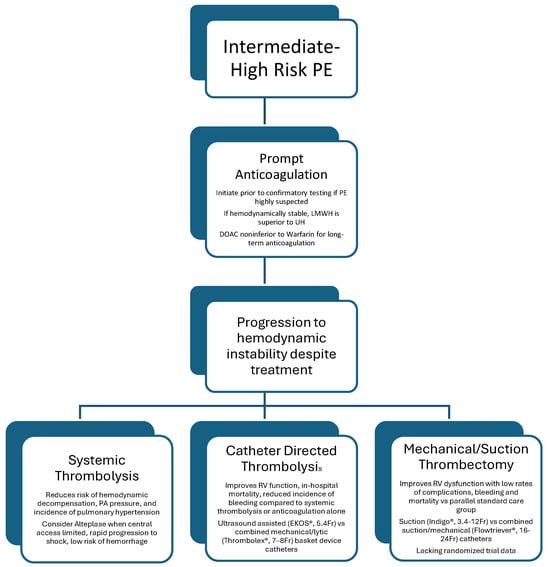 While some can be treated with anticoagulation alone, there is significant heterogeneity in the response to initial treatment within this patient population, and many progress to clinical instability. The Bova score can help further delineate risk and guide the decision to pursue advanced therapy amongst patients already classified in the intermediate high category [14], with patients who score 6 or greater, classified as Bova stage III, demonstrating a rate of death, hemodynamic collapse, or recurrent nonfatal PE of 42%. In patients at high risk of clinical deterioration, the indications, timing, and selection of advanced therapies are still poorly defined and continue to evolve. Here, we discuss treatment options for intermediate high-risk patients, including systemic thrombolysis, catheter-directed thrombolysis, and mechanical thrombectomy, with Figure 1 summarizing indications, available evidence, and clinical considerations for each.