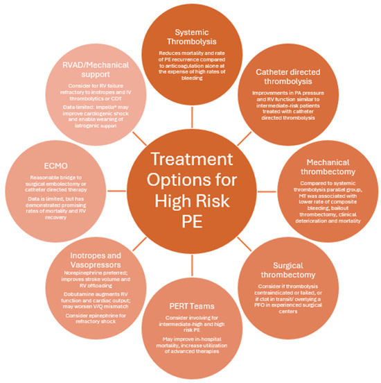 Pulmonary embolism (PE) continues to contribute to significant morbidity and mortality in patients worldwide, despite large advances in treatment. Patients presenting with hemodynamic collapse demonstrate mortality rates between 17.2% and 42.1%, even with utilization of advanced support such as extracorporeal membrane oxygenation (ECMO) [1,2]. Amongst all comers with PE, contemporary data for 2016–2019 demonstrate an in-hospital mortality of 6.5% [1]. Innovations in the treatment of PE have rapidly expanded to include a variety of surgical, mechanical, catheter-based, and medical therapies. In high-risk PE patients reported from a large nationwide database, catheter-directed therapies were used in 6.6% of cases [3]. However, the strength of evidence across the diverse menu of therapeutic modalities is heterogeneous, with guideline recommendations that either insufficiently guide management or differ considerably among societies. Despite the widespread adoption of multidisciplinary pulmonary embolism response teams (PERT), originally aimed at navigating treatment within this relatively evidence-poor field, as well as several ongoing trials to decipher the optimal treatment modalities for PE at various levels of risk, the overwhelming absence of level one evidence makes management of high-risk PE a complex and nuanced topic. Here, we review the pathophysiology, risk-stratification, interdisciplinary care, and evidence regarding therapies in the management of PE in the context of societal guidelines.