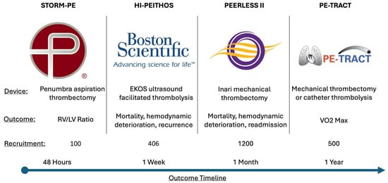 - Sista, A.K.; Troxel, A.B.; Tarpey, T.; Parpia, S.; Goldhaber, S.Z.; Stringer, W.W.; Magnuson, E.A.; Cohen, D.J.; Kahn, S.R.; Rao, S.V.; et al. Rationale and Design of the PE-TRACT Trial—A Multicenter Randomized Trial to Evaluate Catheter-Directed Therapy for the Treatment of Intermediate-Risk Pulmonary Embolism. Am. Heart J. 2024, in press. [Google Scholar] [CrossRef] [PubMed]