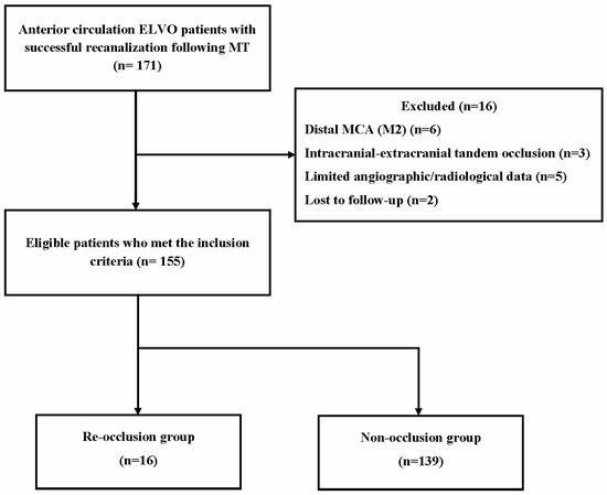 Therefore, we aimed to identify the risk factors associated with postprocedural arterial re-occlusion after successful thrombectomy in patients diagnosed with anterior circulation ELVO by comparing the clinical and radiological characteristics between patients with and without re-occlusion. Additionally, we sought to evaluate the clinical outcomes of re-occlusion in these cohorts.