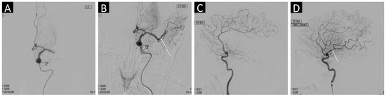 The modified Thrombolysis in Cerebral Infarction (mTICI) score was used to evaluate angiographic results. A final cerebral angiography demonstrating an mTICI score >2b was deemed successful recanalization [18]. The presence of remaining embolic fragments or stenosis presenting intraluminal focal filling defects after successful recanalization on final cerebral angiography was further analyzed (Figure 2) [12]. Re-occlusion of the treated vessel after successful thrombectomy was defined as recurrent occlusion of the same target artery where a thrombectomy was performed [19]. The re-occlusion was confirmed by follow-up vascular imaging (mainly magnetic resonance imaging with angiography) conducted 7 days after the procedure, or earlier in cases of neurological worsening. Occlusion of the other large vessel or iatrogenic embolization in previously unaffected regions during the procedure was not regarded as re-occlusion [10]. Angiographic data were evaluated by two physicians blinded to clinical information. Clinical outcomes included the NIHSS scores at discharge, functional outcomes, mortality, and the occurrence of hemorrhagic complications. Functional outcomes were assessed 3 months after treatment using the modified Rankin Scale (mRS) scores. We defined mRS scores ≤2 as functional independence. Intracranial hemorrhage (ICH) detected on postprocedural brain CT scans or follow-up magnetic resonance imaging was regarded as symptomatic ICH if the NIHSS score increased by >4 points from baseline [20].