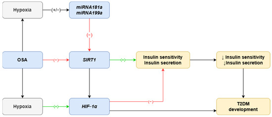 Role of miRNA181a, miRNA199a, HIF-1α, and SIRT1 in development of T2DM in OSA patients. SIRT1 increases insulin sensitivity and insulin secretion. Level of SIRT1 is lower in patients suffering from OSA, which is responsible for insulin resistance and insulin-reduced secretion followed by T2DM development. Hypoxia-sensitive miRNAs are one possible mechanisms of SIRT1 decreasing in OSA patients. Moreover, SIRT1 may act via HIF-1alfa, which is responsible for activation of vast number of genes. OSA—obstructive sleep apnea; T2DM—type 2 diabetes mellitus; SIRT1—sirtuin 1; HIF-1α—hypoxia-inducible factor 1α.