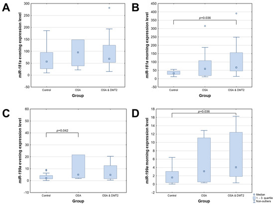 Dependencies in evening and morning expression levels of miR-188a and miR-199a. (A) evening expression of miR-181a (p = 0.191), (B) morning expression of miR-181a (p = 0.043), (C) evening expression of miR-199a (p = 0.038), (D) morning expression of miR-199a (p = 0.035). Results of post hoc (Dunn’s test) shown in figure. OSA—obstructive sleep apnea; T2DM—diabetes mellitus type 2.