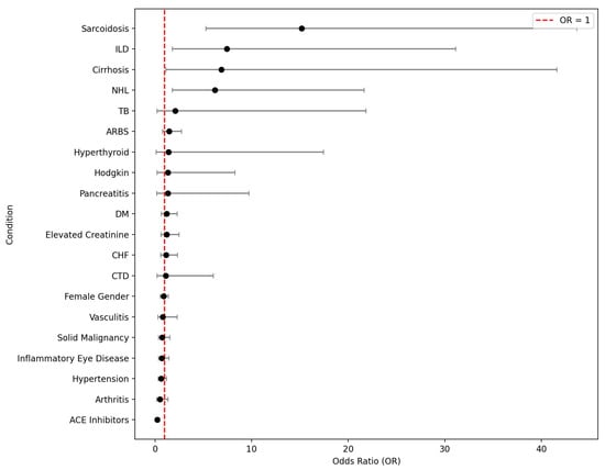 In a univariate analysis, ACE levels were increased in patients with sarcoidosis, lymphoma (Hodgkin’s and non-Hodgkin’s), leukemia, cirrhosis, interstitial lung disease, Gaucher’s disease, hypertension, heart failure, and in those not taking ACE inhibitors. In a multivariate analysis using a Cox proportional hazards regression model, it was found that sarcoidosis, non-Hodgkin’s lymphoma, lack of ACE inhibitor use, cirrhosis, and interstitial lung disease significantly increased the risk of elevated ACE levels. Figure 1 shows the odds ratios for increased ACE levels for the different conditions that were included in the analysis. When excluding 257 patients treated with ACE inhibitors from the analysis, sarcoidosis, non-Hodgkin’s lymphoma, cirrhosis, and interstitial lung disease still significantly increased the risk of elevated ACE levels.
