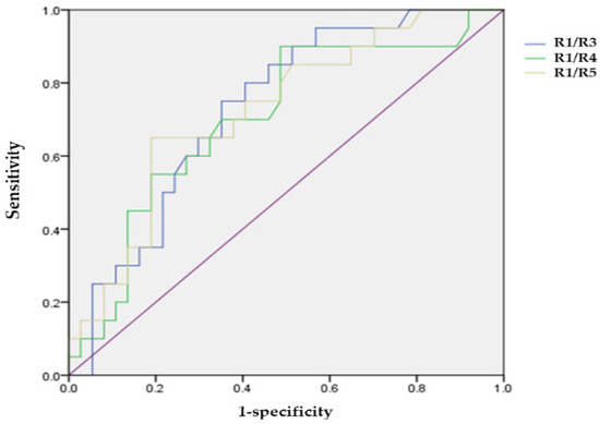In groups 1A and B, the areas under the ROC curve of the ring ratios R1/R3, R1/R4, and R1/R5 were 0.730, 0.702, and 0.724, respectively (p = 0.004, 0.012, and 0.006). Their cut-off values were 3.84 (R1/R3), 5.60 (R1/R4), and 6.09 (R1/R5), respectively, which showed a greater significance for the high risk of subclinical HCQ retinopathy (Figure 2).