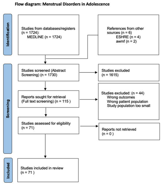 The aim of this review is to provide an overview of the various menstrual disorders in adolescence to differentiate these from menstrual disorders in adulthood and to describe their etiology and treatment. For this purpose, a systematic literature search was conducted in the PubMed database in April 2024 using the following term: “menstrual disorder adolescence”. All relevant articles from the last 10 years were included. Only English-language studies were included. The abstracts of 1724 articles were screened. Out of these 1724 abstracts, 115 articles were included in the full-text screening. These studies were analyzed narratively through content analysis. Of the 115 articles, 71 were included in the review (Figure 1). Cycle irregularities and disorders of various causes were the principal variables of interest. The inclusion criteria were studies of good quality related to patients in adolescence. Original articles that provided relevant information on menstrual irregularities or disorders in adolescence were included. In addition, a supplementary literature search of the relevant literature from the guidelines of the European Society of Human Reproduction and Embryology (ESHRE) and the guidelines of the Arbeitsgemeinschaft der wissenschaftlichen medizinischen Fachgesellschaft (awmf) was carried out.