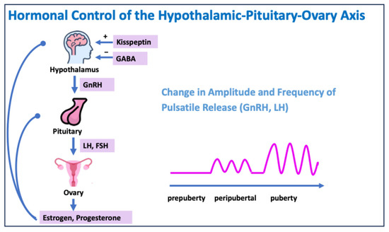 LH and FSH regulate the secretion of testosterone, estradiol, and progesterone in the gonads, which leads to the development of secondary sexual characteristics (Figure 2) [2].
