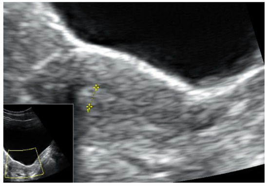Inspection of the external genitalia is performed by the separation and traction of the labia majora, with discrete lateral or caudal traction. A pediatric speculum is rarely required for the examination. The sonographic assessment is performed by abdominal sonography with a full bladder (Figure 3 and Figure 4). The uterus and ovaries are assessed here, with the shape of the uterus providing information about the degree of estrogenization. Endometrial thickness, the antral follicles in the ovaries, and the presence of cysts or follicular persistence are also assessed. To answer specific questions, a genetic examination, magnetic tomography (MRI), and, rarely, laparoscopy can supplement the diagnosis. Certain situations make various functional tests useful: a GnRH (gonadotropin-releasing hormone) test to check pituitary function, an ACTH (adrenocorticotropic hormone) test in the case of congenital adrenal hyperplasia (CAH), a progestogen test to check whether there is sufficient endogenous estrogen activity and endometrial function in the case of amenorrhea, and an estrogen–progestogen test to assess the responsiveness of the endometrium in the case of uterine amenorrhea.