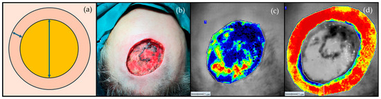 Schematic representation of the regions of interest relating to the graft bed (long arrow) and graft margin with a 1 cm width (short arrow) (a). Clinical image of the surgical defect (b), and LSCI perfusion image of the graft bed (c) and graft margin (d). Darker colours (black and blue) denote a poor perfusion assessed using LSCI, while the yellow to red colours represent a high perfusion.