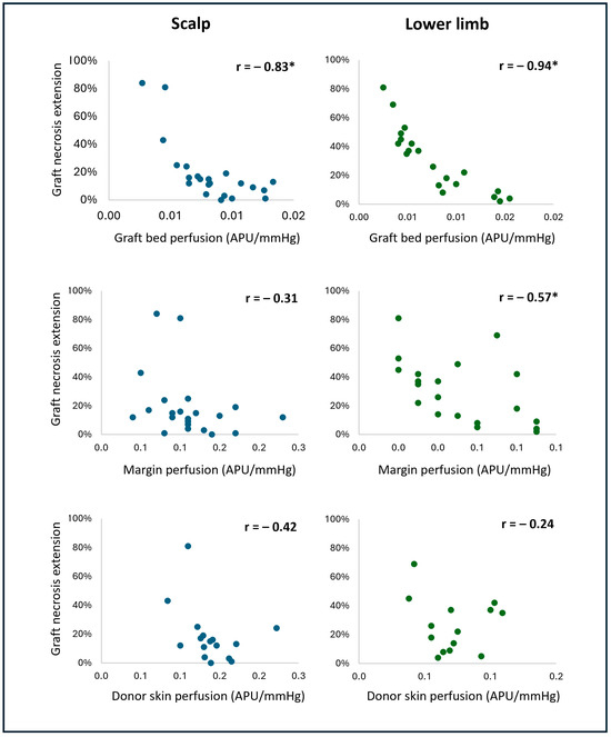 Fisher’s z-test was performed to compare the correlation between graft bed perfusion and necrosis extension on the scalp and lower limb. The difference between the correlations was statistically significant, with the correlation being stronger in the lower limb (z = 1.8, p = 0.03).