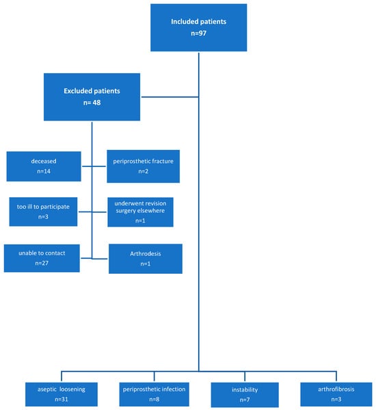 A total of 97 consecutive patients who underwent knee revision surgery between 2006 and 2009 at our institution were included in the study [2,3]. The mean follow-up period was 29.2 ± 9.9 months (range 12–51 months) [4]. All patients underwent revision total knee arthroplasty (TKA) using a modular semi-constrained prosthesis (Legion, Smith & Nephew, Dover, MA, USA). The Knee Society Score (KSS) was recorded preoperatively, at three months, and annually postoperatively. In 22 cases, the revision surgery was necessitated by a confirmed periprosthetic infection. In 75 patients, a one-stage TKA exchange was performed due to aseptic failure [5]. Aseptic loosening was observed in 55 patients, instability in 13 cases, and arthrofibrosis in 7 cases (Figure 1). Incomplete changes, such as conversion from unicompartmental knee arthroplasty (UKA) to bicondylar prostheses [6] and isolated component changes, as well as arthrodesis, were excluded from the study.