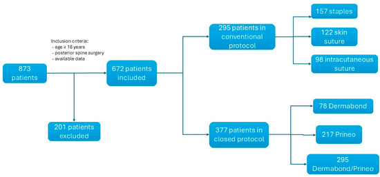 A retrospective study involving two neurosurgical centers (Geneva University Hospital, Switzerland, and Innsbruck University Hospital, Austria) was undertaken to assess the SSI rates of patients undergoing posterior spine surgery between June 2015 and December 2019. Research ethics board approval was received at both sites. All patients > 18 years old undergoing posterior spine surgery with complete data available were included (Figure 1). Data were retrospectively collected to assess the risk of infection, including age, sex, obesity, body mass index (BMI), smoking status, chronic corticosteroid treatment, and comorbidities, such as diabetes mellitus, cancer, immunosuppression, HIV status, and MRSA status. Data on the surgical procedure were also collected, including the type of surgical procedure (emergency, elective, or revision surgery), number of levels treated, duration of the procedure, blood loss, presence of dural tears, use of drain wound, type of wound closure, presence of wound infection (superficial or deep), and type of germ isolated. Finally, we collected data on general risk factors, such as the preoperative American Society of Anesthesiology (ASA) score, national nosocomial infections surveillance (NNSI) score, and surgical site infection risk score (SSIRS).