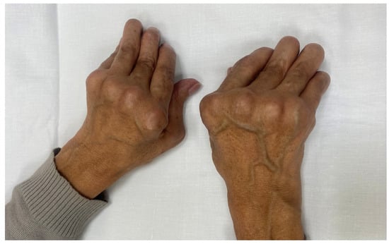 - Case 3. Felty Syndrome. The patient is a 46-year-old woman with RA according to EULAR/ACR criteria [7], with poor prognostic characteristics (high levels of activity, RF+, ACPA+, erosions and poor physical function) as evaluated in 2011, with poor compliance. From 2011 to 2015, she received irregular treatment with methotrexate, leflunomide, and low doses of oral prednisone and refused bDMARDs. In 2019, she returned to the clinic with six swollen joints, eight tender joints, 6 cm of visual analogue scale of pain (0 = no pain to 10 = maximum pain), and 6 cm of VAS of RA activity (0 = no activity to 10 = maximum activity), with DAS28PCR 5.07, HAQ 1.5 and poor perception of health. We found hand deformity with ulnar burst and swan neck fingers (Figure 1).