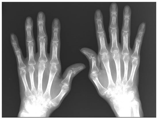 Her laboratory data were as follows: hemoglobin 10.7 g/dL, total leukocytes 3850× mm3, total neutrophils 1000× mm3, serum IgA 693 mg/dL, serum IgG 2706 mg/dL, serum IgM 868 mg/dL, FR 522 UI/dL, ACPA > 340 U/mL, ESR 35 mm/hora, CRP 15 mg/dL. Her X-rays showed ulnar subluxation of bilateral first finger interphalangeal, with erosions in carpals, metacarpophalangeal and proximal interphalangeal (Figure 2) as well as erosions in metatarsal heads.