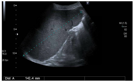 Treatment was attempted with adalimumab and etanercept, which she did not tolerate and preferred low doses of prednisone (1.25 to 5 mg/day). She evolved poorly with persistent RA activity (DAS28-PCR index between 4.5 to 6.0) and pancytopenia (mild to moderate anemia, neutropenia, lymphopenia, and thrombocytopenia), without clinical manifestations. Abdominal ultrasound was performed for suspected Felty syndrome, confirming 14 cm splenomegaly (Figure 3).