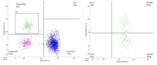 The patient did not agree to complete the hematological study (bone marrow aspiration and large granular cell leukemia study). After multiple attempts to reach a consensus on diagnostic test and treatment without success, she was admitted due to fever, nosebleeds and anemic syndrome related to severe thrombopenia plus pancytopenia. Upon admission, she had fever without infection. After multiple blood urine cultures and specific serology, her laboratory tests showed Hb 7.9 g/dL, hematocrit 26.4%, total leucocytes 3770× mm3, total neutrophils 1400× mm3, platelets 28,000× mm3, serum IgA 1004 mg/dL, serum IgE 107 UI/mL, serum IgG 6038 mg/dL, serum IgM 611 mg/dL, ESR 125 mm/hora, CRP 22.4 mg/L, serum amyloid 3.34 mg/L, procalcitonin 0.32 ng/mL, RF 5623 U/L and ACPA > 340 U/mL. Multiple myeloma (absence of serum monoclonal protein, heavy chain expression by immunofixation, urinary monoclonal protein) and large granular lymphocyte leukemia (absence of CD8+ cell proliferation by flux cytometry) were ruled out (Figure 4).