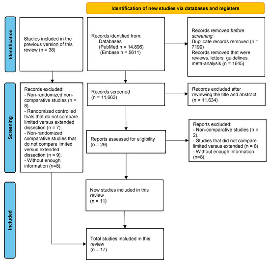 We identified 11,663 records after removing duplicates, reviews, letters, guidelines, and meta-analyses, followed by a screening of titles and abstract reviews, and subsequently, 29 full-text articles were reviewed. Studies were excluded if they did not compare limited versus extended lymphadenectomy according to our definition, if they were not comparative studies, and if they lacked enough data to extract for analysis [8,30,31,32,33,34,35,36,37,38,39,40,41,42,43]. Out of the studies included from the systematic revision by Mogal et al. [24], studies were excluded if they were non-randomized non-comparative, if they did not compare extended versus limited lymphadenectomy according to our definition, and if they did not have enough information to extract [6,44,45,46,47,48,49,50,51,52,53,54,55,56,57,58,59,60,61,62,63,64,65,66,67,68]. Finally, 17 studies were considered eligible for this systematic review and meta-analysis (Figure 1).