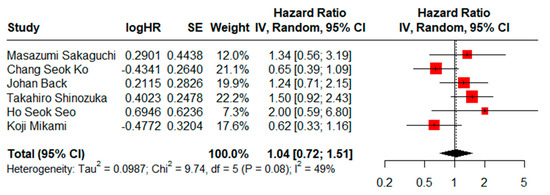 HRs for OS could be assessed in six studies. There was not a statistically significant difference (HR = 1.04, CI95% = 0.72–1.51) using a random effects model and moderate heterogeneity (I2 = 49%, Cochran’s Q test, p = 0.08) (Figure 2), while the result of the sensitivity analysis proved to be stable (Supplementary File S2). No evidence of publication bias was found when generating graphic funnel plots (Supplementary File S3). There also was no evidence of publication bias using the Eggers test (p = 0.6290).