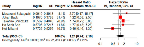 HRs for CSS could be assessed in five studies. There was not a statistically significant difference (HR = 1.24, CI95% = 0.74–2.10) using a random effects model and moderate heterogeneity (I2 = 23%, Cochran’s Q test, p = 0.27) (Figure 4), and the result of the sensitivity analysis proved to be stable (Supplementary File S2). No evidence of publication bias was found when generating graphic funnel plots (Supplementary File S3). There was also no evidence of publication bias using the Eggers test (p = 0.7893).