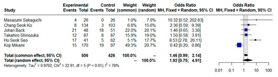 ORs for postoperative complications (Clavien–Dindo ≥ 3) could be assessed in six studies. There was not a statistically significant difference (OR = 1.92, CI95% = 0.75–4.91) using a random effects model and moderate heterogeneity (I2 = 78%, Cochran’s Q test, p < 0.01) (Figure 5), while the result of the sensitivity analysis identified a statistically significant difference in ORs for complications between groups when excluding the study by Mikami et al. [72] (OR = 2.67, CI95% = 1.21–5.87) using a random effects model and moderate heterogeneity (I2 = 51.1%, Cochran’s Q test, p = 0.08) (Supplementary File S2). No evidence of publication bias was found when generating graphic funnel plots (Supplementary File S3). There was also no evidence of publication bias using the Eggers test (p = 0.1705).