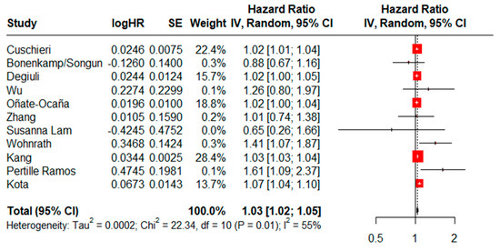 HRs for age as an independent risk factor for OS could be assessed in eleven studies. There was a statistically significant difference (HR = 1.03, CI95% = 1.02–1.05) using a random effects model and moderate heterogeneity (I2 = 55%, Cochran’s Q test, p = 0.01) (Figure 6), while the result of the sensitivity analysis proved to be stable (Supplementary File S2). No evidence of publication bias was found when generating graphic funnel plots (Supplementary File S3), while there was no evidence of publication bias using the Eggers test (p = 0.5686). In the analysis by subgroups according to study design and year of publication, a statistically significant difference between both subgroups was maintained (Supplementary File S4).