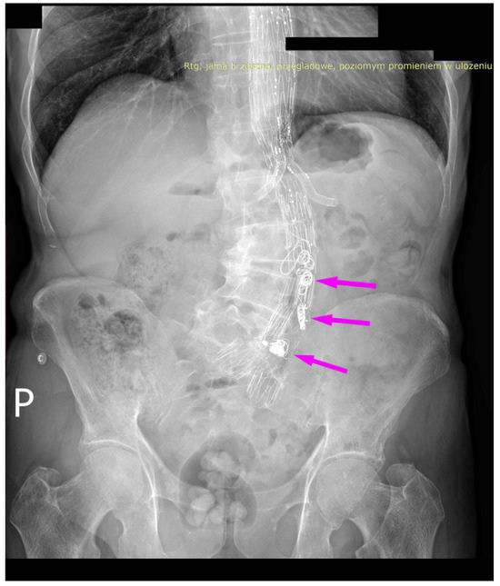 Thoracoabdominal branched stent-graft in the lumen of aorta and visceral arteries. Embolization coils are marked with arrows. Abdominal X-ray.