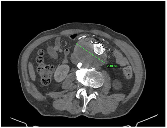 - Onishi, M.; Onishi, Y.; Noda, T.; Yasuo, S.; Kobiki, J.; Arai, Y.; Taniguchi, T. Transcatheter Arterial Embolization of a Type 2 Endoleak through the Dorsal Pancreatic Artery after the Hybrid Repair of a Thoracoabdominal Aortic Aneurysm: A Case Report. Radiol. Case Rep. 2023, 18, 2845–2849. [Google Scholar] [CrossRef]