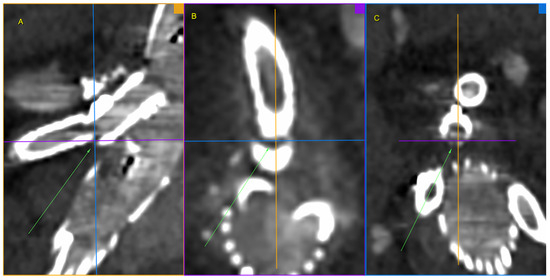 Ruptured superior mesenteric artery branch of stent graft in three planes. The fractured site is centrally located at the intersection of the lines defining the planes and additionally marked with green arrows. Panel (A)—sagittal projection, panel (B)—axial projection, panel (C)—coronal projection. Pre-interventional Angio-CT 3D MPR, arterial phase.
