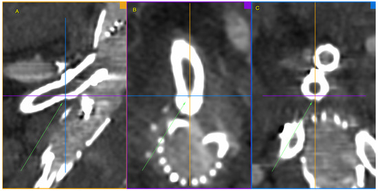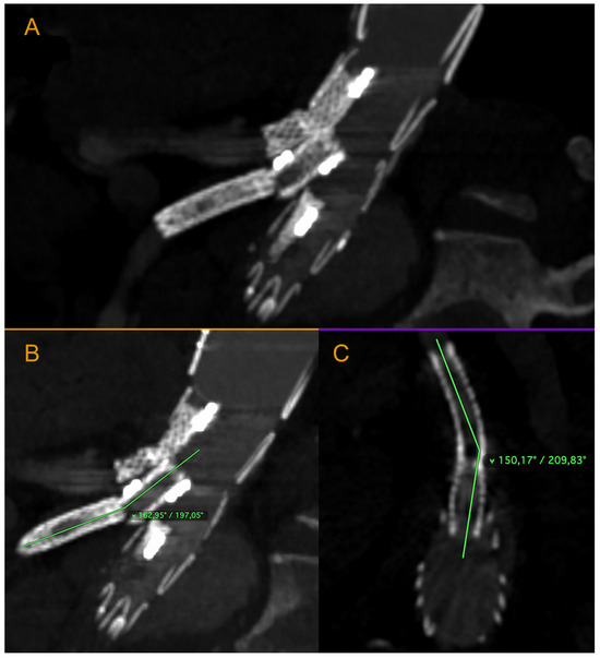 Ruptured superior mesenteric artery branch of stent-graft—the angle between the BeGraft and the vessel. The figure shows a divergence between the axis of the branch and the axis of the superior mesenteric artery. Panel (A)—sagittal projection, panel (B)—sagittal projection with marked angle, panel (C)—axial projection with marked angle. Pre-interventional Angio-CT scans, arterial phase.