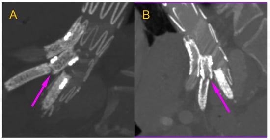 Ruptured superior mesenteric artery branch of stent graft—curved planes. The fractured site is marked with an arrow. Panel (A)—first projection, panel (B)—second projection. Pre-interventional Angio-CT Curved MPR, arterial phase.