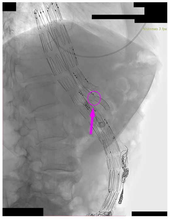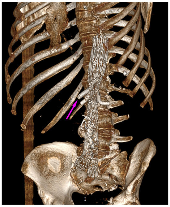 Currently, f/b-EVAR procedures stand as the preferred approach for TAAA treatment due to their minimal invasiveness and favorable long-term outcomes [28]. Fenestrated and branched endovascular aneurysm repair (F/B-EVAR) has demonstrated high rates of technical and clinical success and low early postoperative mortality [2,29,30,31]. A recent study showed that the use of the Cook t-Branch has proven to be safe and effective in treating complex aortic aneurysms, regardless of the aortic lumen’s caliber [32]. This approach has been shown to be feasible even when maneuverability is reduced, offering low mortality and morbidity rates, as well as acceptable reintervention rates [32]. f/b-EVAR seems to offer a benefit regarding early mortality and perioperative complications compared to open repair [1,29]. While modern technologies and materials have facilitated the treatment of large aneurysms with minimal patient burden, as illustrated by our case, these methods entail the risk of serious complications. Potential complications include endoleak, kinking, fracture, migration, occlusion, and stenosis [33]. This failure mode, in which a branch stent fracture leads to branch vessel perforation, represents a failure not only of the bridging stent (B-Graft) but also of the aortic component (t-Branch). In the largest retrospective analysis to date, including more than 500 consecutively treated patients provided with the t-Branch device for elective and urgent aortic conditions, the authors observed high technical success rates and acceptable levels of mortality and morbidity after 30 days, emphasizing its complementary value for complex endovascular aortic repair [17]. Over time, the combination of progression of vascular disease, endothelial proliferation, continuous arterial movement, and material fatigue may also affect target vessel patency [34]. A propensity score analysis of patients with TAAA undergoing repair suggested an early benefit from endovascular repair compared to open surgery [35]. This advantage is reflected in the composite endpoint, primarily due to reduced 30-day respiratory complications [35]. Despite the absence of explicit guidelines detailing the management of spontaneous rupture of a stent-graft branch, the increasing prevalence of endovascular procedures and the departure from conventional operations suggest a potential rise in such complications. Therefore, recommendations are needed to prevent graft destruction, including more detailed consideration of various anatomical types and improved branch fixation.