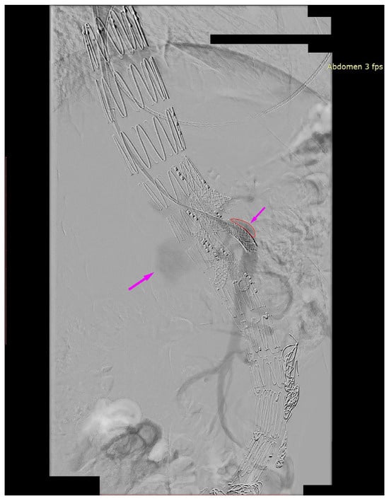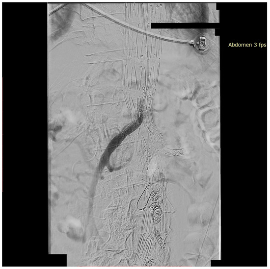 We present the case of an 82-year-old male patient who appeared in the emergency department due to progressive weakness and abdominal pain (2024). Due to a drop in blood pressure to 80/40 mmHg, a continuous infusion of norepinephrine was initiated. The hemoglobin level was approximately 5.1 g/dL. His medical history included generalized atherosclerosis, renal failure, and a thoracoabdominal aortic aneurysm (TAAA) treated with endovascular aneurysm repair (EVAR) using stent-graft implantation 4 years earlier (2020). At that time, the angio-CT scan revealed an aneurysm starting just below the celiac trunk, extending to the superior mesenteric artery (SMA) and both renal arteries (RAs). The maximum diameter of the aortic aneurysm was 51 mm; however, the left common iliac artery measured 41 mm in diameter, an indication for thoracoabdominal stent graft implantation. The aortic aneurysm itself was completely free of mural thrombus. The patient had also experienced a heart attack 16 years earlier and a transient ischemic attack (TIA) 2 years earlier. Following the stent graft implantation, he underwent multiple successful interventions to address endoleaks. One year after implantation, endovascular treatment with embolization coils was performed to eliminate leakage from the lumbar artery (LA) (2021). Three years post-implantation, he was admitted to address leakage from the inferior mesenteric artery (IMA) using embolization coils as well (Figure 1) (2023). In 2024, an X-ray and CT scan revealed a rupture in a branch of the stent graft located in the SMA in its middle part, along with an enlarged aneurysm sac (74 mm) due to the fracture and leakage (Figure 2, Figure 3, Figure 4 and Figure 5). The angio-CT scan did not reveal any contrast extravasation beyond the vessel wall. However, significant contrast leakage was visible in the area of the visceral arteries within the aneurysm sac. The implanted device was the Zenith t-Branch Thoracoabdominal Endovascular Graft, and the ruptured branch was identified as the Bentley BeGraft (Bentley InnoMed GmbH, Hechingen, Germany). Urgent surgical intervention was performed. Intraoperative angiography (IA) showed a breach in the continuity of the BeGraft material within the SMA, with contrast leakage into the aneurysm sac (Figure 6 and Figure 7). To address the leakage and restore the continuity of the SMA branch, an additional BeGraft Plus 8 × 57 mm was implanted into the damaged branch. Subsequent IA and control CT scans confirmed the elimination of leakage, restoration of stent graft continuity, and revascularization of the SMA (Figure 8, Figure 9 and Figure 10). The surgery was completed without complications, and the patient was discharged home in good general condition. The patient returned for follow-up 3 weeks after the last intervention. An angio-CT examination was performed, revealing no enlargement of the aneurysm sac (74 mm), confirming the elimination of the endoleak, and demonstrating successful revascularization of the SMA. Ongoing follow-up will be continued.