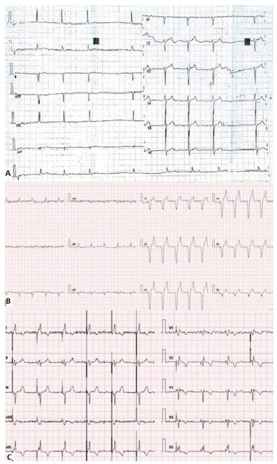 The presentation of the patients’ ECG before LP implantation—QRS duration 100 ms (A), after LP implantation with VVI pacing—QRS duration 160 ms (B), after CRT-P implantation with biventricular pacing—QRS duration 100 ms (C).