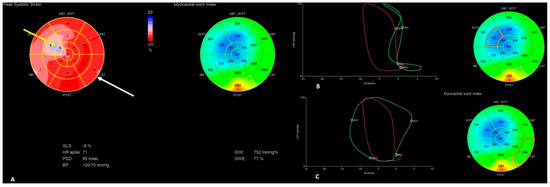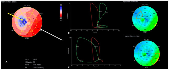 The “Bull’s-eye” representation of longitudinal strain (A) and myocardial work index (B,C) measurements during the first HF exacerbation; the yellow arrow indicates the area characteristic for PICM RV deformation pattern: decreased longitudinal strain and myocardial work indexes in septal middle and apical segments of the LV; the white arrow indicates the excessive myocardial work of lateral wall segments; (B) the green chart indicates ineffective myocardial work of the anterior part of the intraventricular septum; (C) the green chart indicates excessive myocardial work of the lateral wall segments.