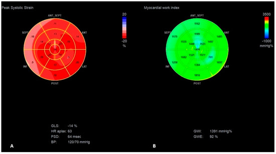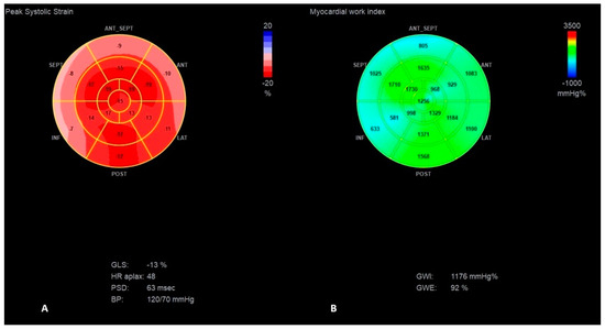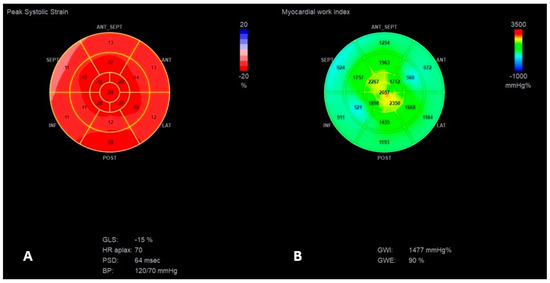 The “Bull’s-eye” representation of longitudinal strain (A) and myocardial work index (B) measurements before LP implantation.