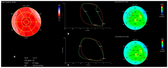 The “Bull’s-eye” representation of longitudinal strain (A) and myocardial work index (B,C) measurements after CRT-P implantation with a significant improvement in septal segmental strain and MWI values. (B,C) presents the significant improvement in myocardial work values for intraventricular (B) and lateral (C) segments.
